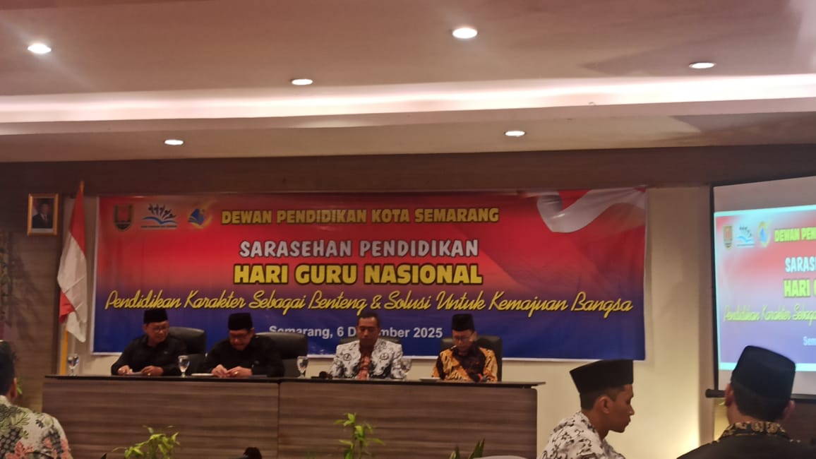 Semarang-Dalam rangka memperingati Hari Guru Nasional, Dewan Pendidikan Kota Semarang menyelenggarakan Sarasehan Pendidikan bertema “Pendidikan Karakter Sebagai Benteng dan Solusi Untuk Kemajuan Bangsa” pada Sabtu, 6 Desember 2025. Acara yang digelar di Hotel Candi Indah, Jl. Dr. Wahidin No. 112 Semarang, berlangsung sejak pukul 09.00 hingga 12.00 WIB dan diikuti 100 peserta yang terdiri atas kepala sekolah SD, SMP, SMA, dan SMK se-Kota Semarang, para ketua komite sekolah, ketua PGRI kecamatan, serta sejumlah tokoh pendidikan dari berbagai wilayah kota ini.