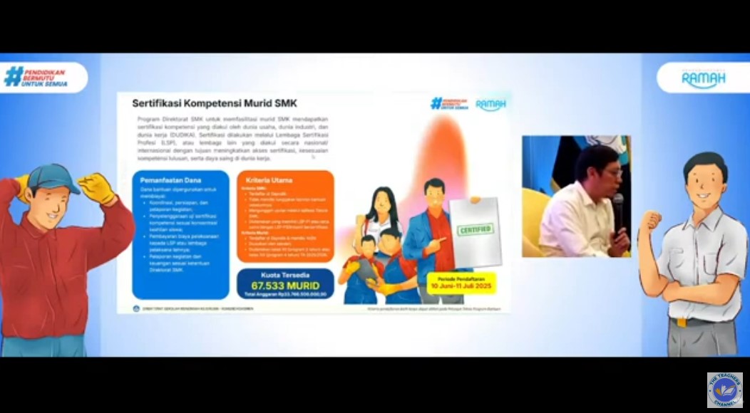 Sementara itu, program teaching factory (TEFA) dirancang untuk menjembatani pembelajaran di sekolah dengan praktik dunia kerja nyata. Dalam paparannya, Hernita dari Subdirektorat Sarana Prasarana dan Tata Kelola menegaskan pentingnya TEFA berbasis produk nyata dan dukungan konsultan industri.