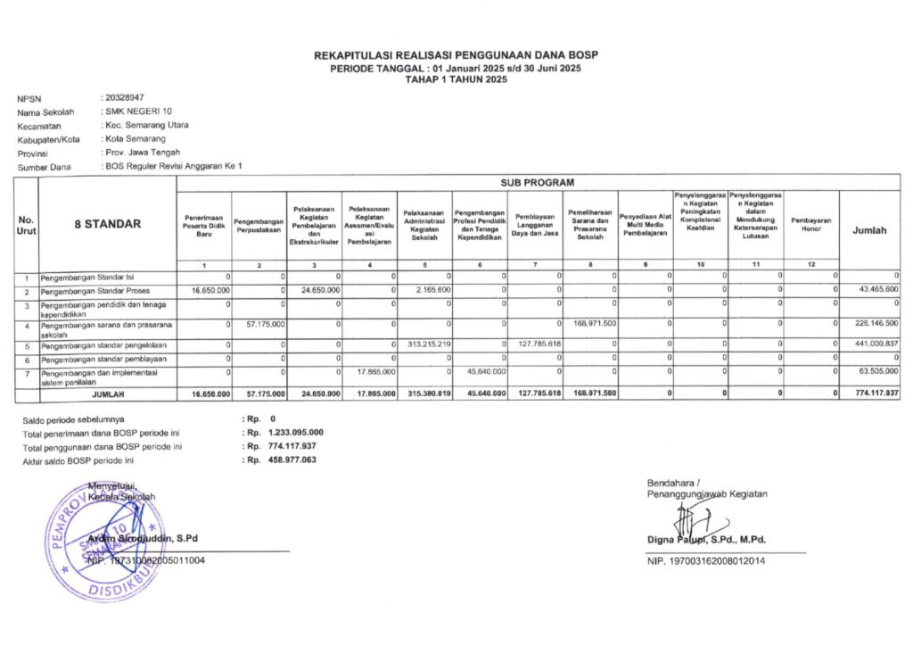 Laporan realisasi penggunaan Dana BOS SMK Negeri 10 Semarang tahun 2025 bisa dilihat disini